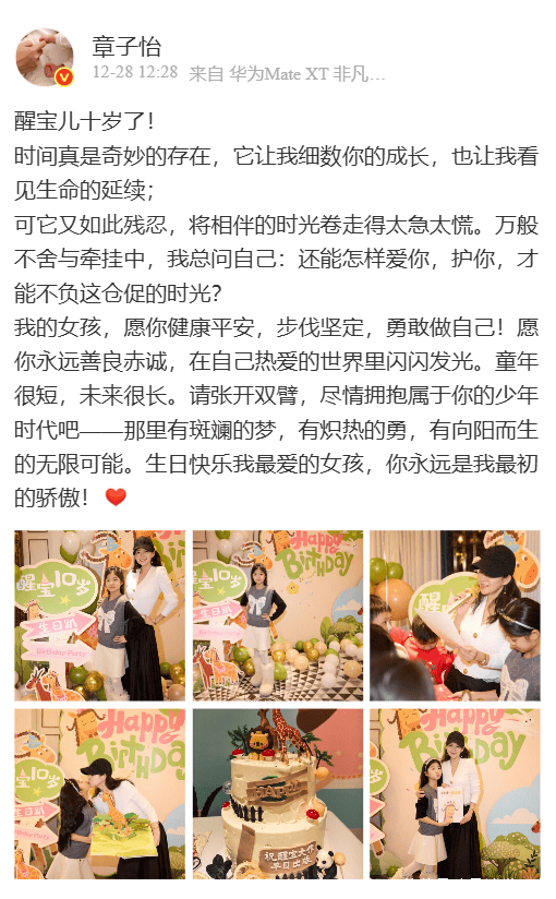 在12月28日,章子怡在自己的社交平台上晒出为女儿庆生的美照,还写了一段小作文送给女儿,让人看的非常动容,不知不觉,醒醒都已经10岁了,为女儿取这个名字除了让女儿时时刻刻清醒,也是提醒自己要保持清醒吧!